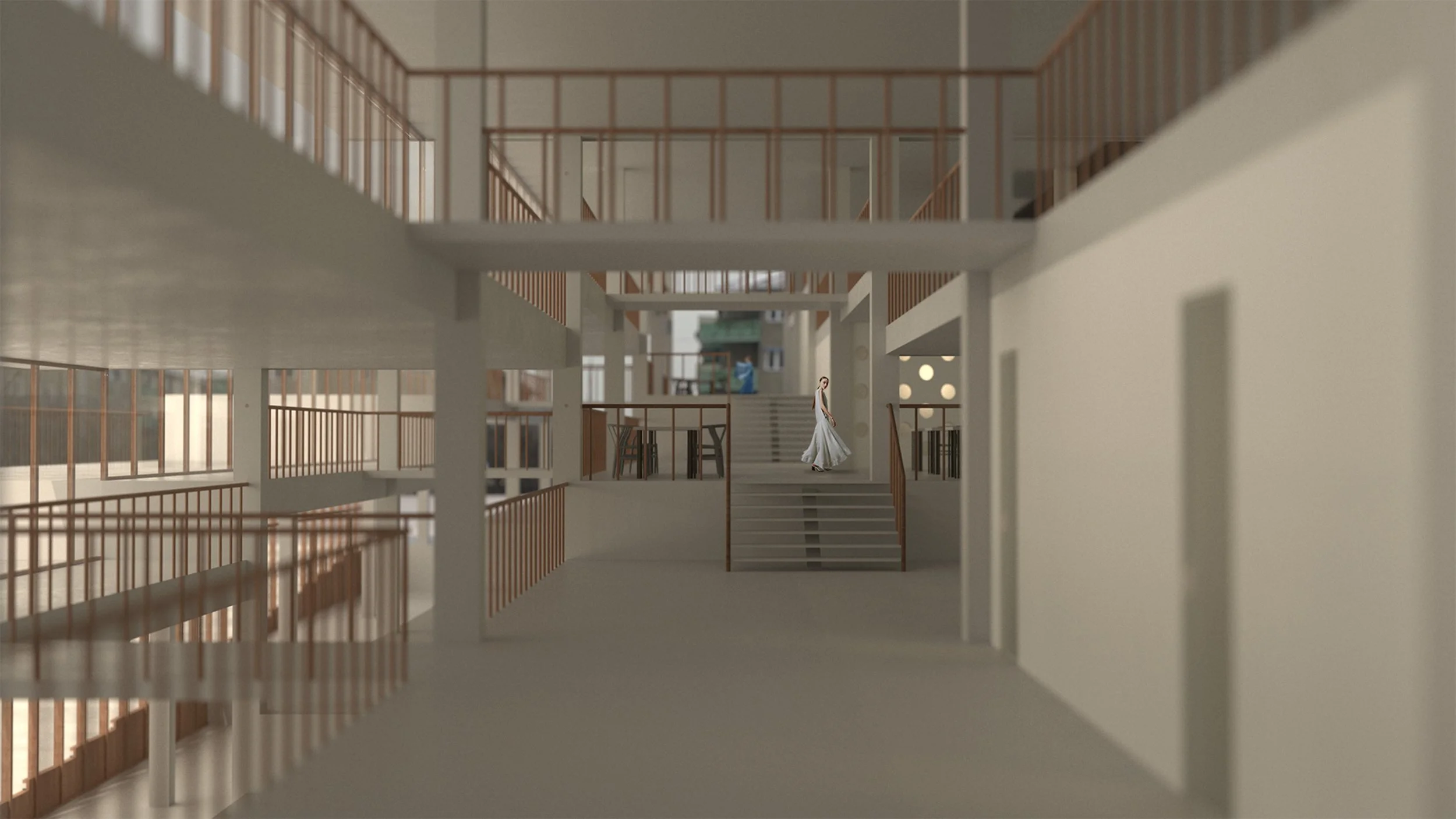 Because of the large size of the building, I chose to dig much of the structure down into the ground. This allowed the project to be more humane towards its surroundings, working with the Botanical Garden rather than casting a shadow over it. This move also created a public street running through the middle of the project. The area previously felt quite dark, open, and somewhat unsafe, but the new street would hopefully create a safer and more active space for people to move through. The street also serves as the main entrance to the public auditoriums and the office buildings.